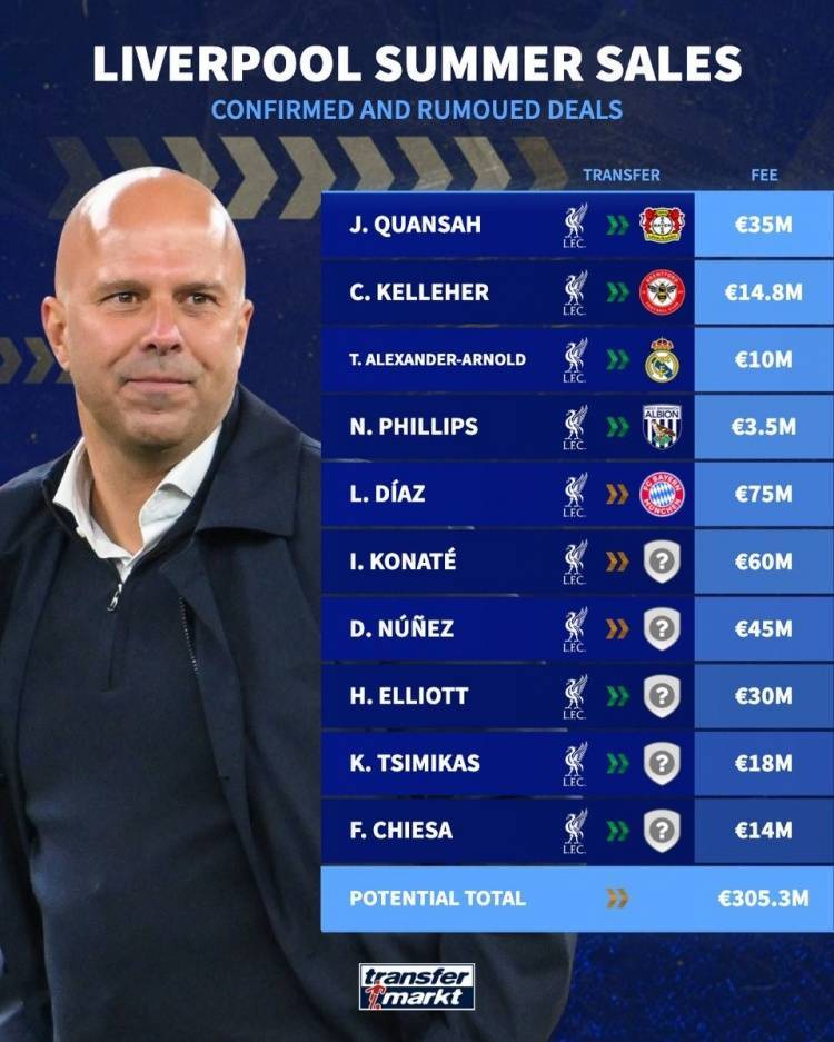德转预测利物浦今夏卖人:总转会费3.053亿欧元